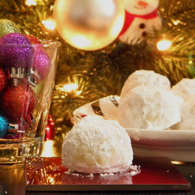 • When baked, remove the sheet from the oven, and while still warm, roll the cookies in a small bowl with the 1 1/4 cup of powdered sugar until coated. Cool completely on a wire rack, then roll once more.